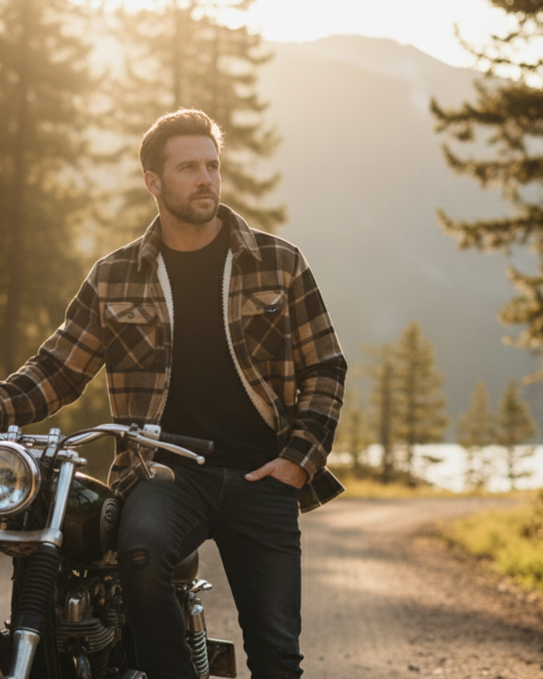 Sherpa-lined checked shirt jacket. A go-to piece for cold mornings, long rides, and everything in between. Soft on the inside, structured on the outside.